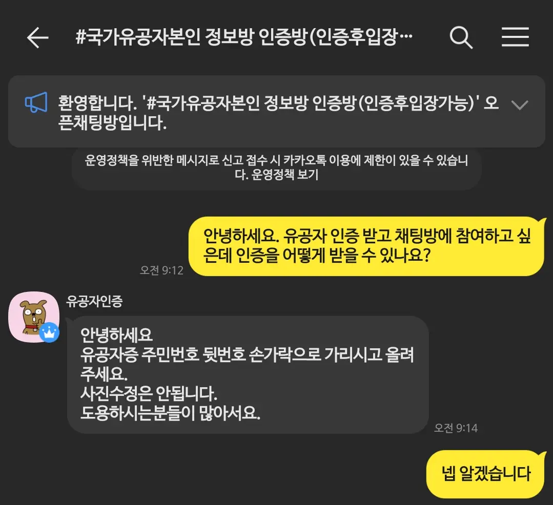 많은 국가유공자분들이 이 채팅방에서 함께 정보를 교류하고, 이야기를 나눌 수 있었으면 좋겠습니다. 고맙습니다.