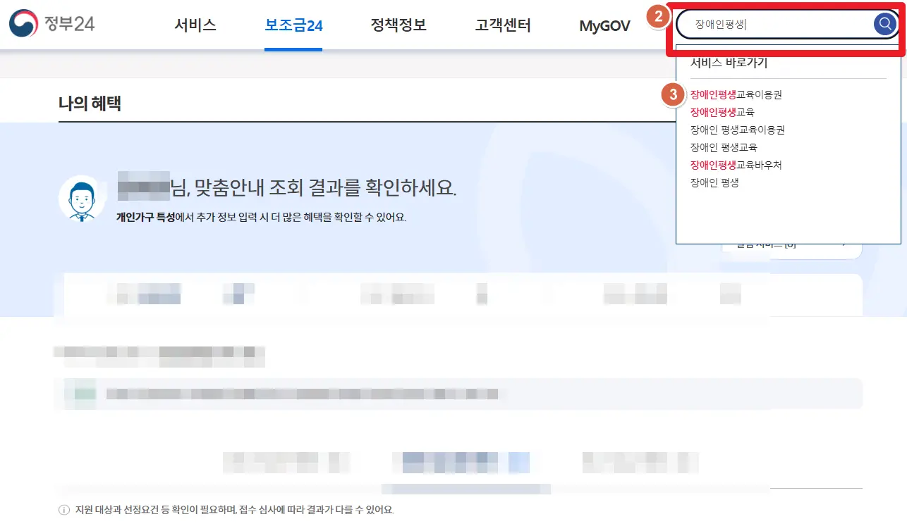 2. 우측 상단에 "장애인평생교육이용권"을 검색합니다.