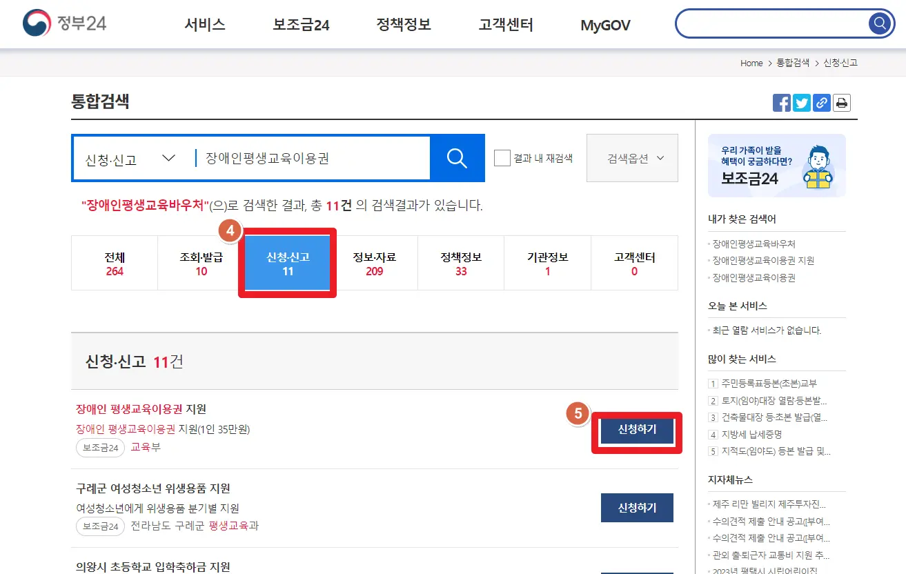 3. "신청·신고"를 클릭 후 "장애인 평생교육이용권 지원 신청하기" 를 클릭합니다.