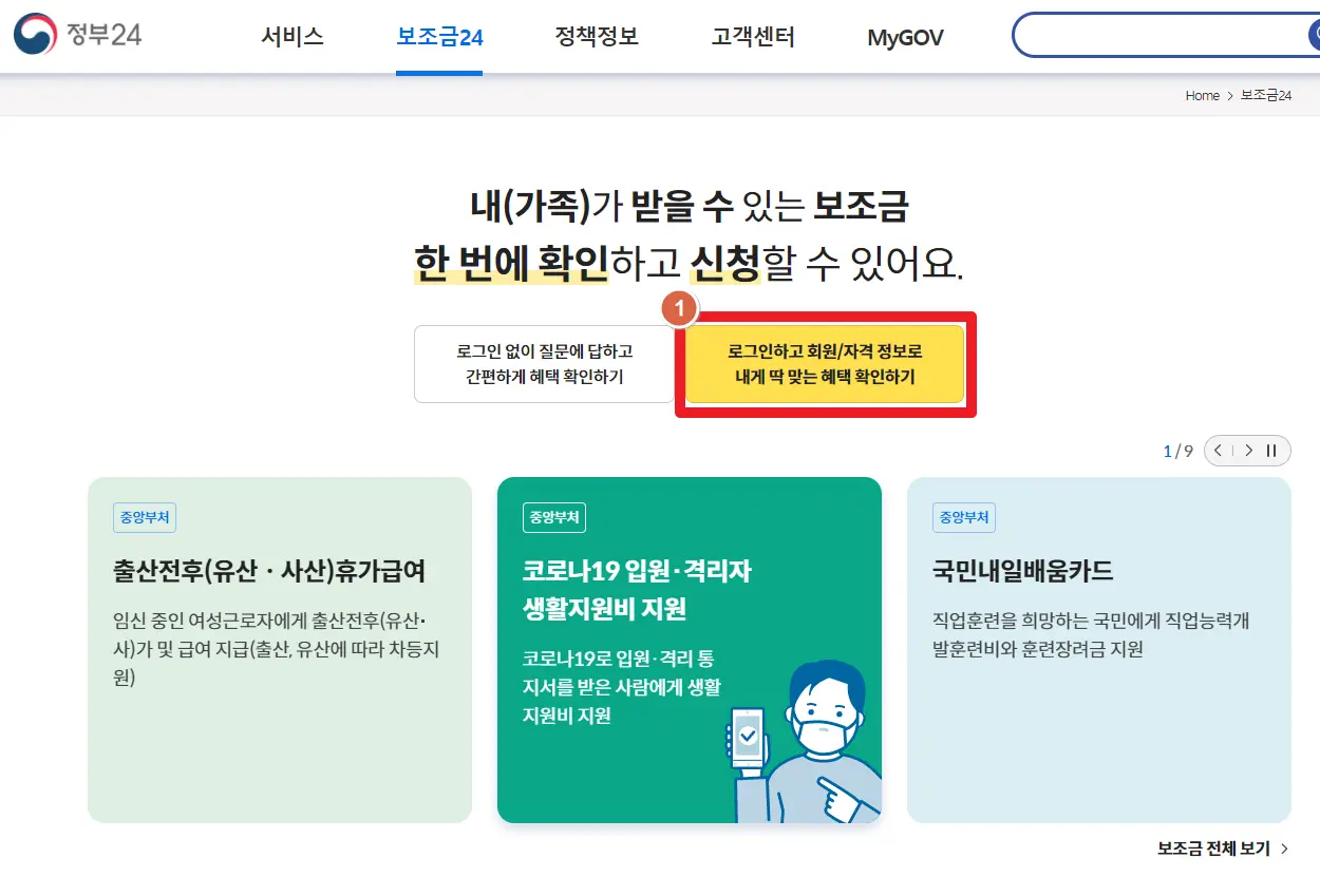 1. 정부24(보조금24)사이트에 접속하고, 로그인 합니다.